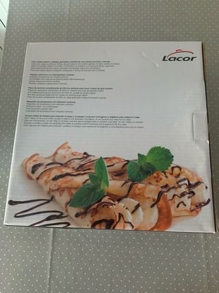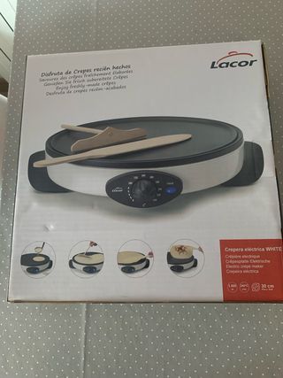 Crepera eléctrica Lacor, completamente nueva y sin abrir, lista para estrenar. Incluye todos sus accesorios originales para que puedas empezar a hacer crepes y tortitas al momento. - Diámetro de la placa: 30 cm. - Potencia: 1000W.
