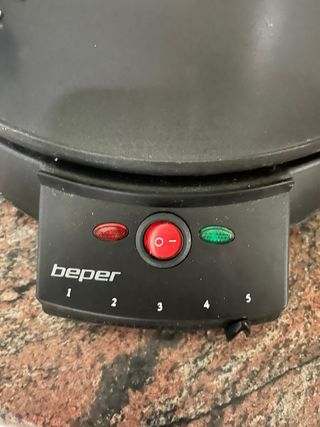 Plancha eléctrica para hacer crepes de la marca Beper. - Superficie antiadherente. - Control de temperatura ajustable. - Indicador luminoso de encendido.