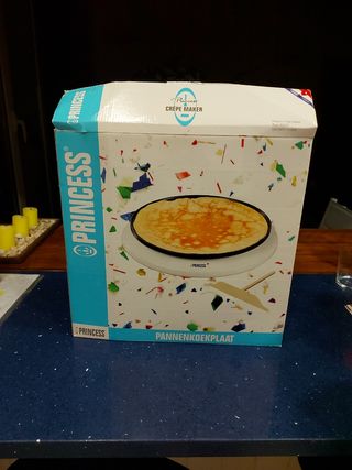 Crepera Princess Blanca de 30 cm, termostato regulable, 1100 W, revestimiento antiadherente. La crepera está usada pero perfecta. La caja no, ya que la hemos guardado ahí siempre para protegerla. *En persona