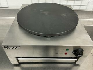 Crepera eléctrica de la marca TON, ideal para preparar crepes y tortitas. - Superficie de cocción antiadherente. - Indicadores luminosos de encendido y calor. - Control de temperatura ajustable. - Construcción en acero inoxidable.