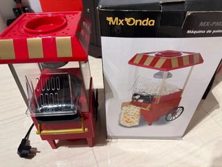 Máquina de palomitas con un divertido diseño retro, perfecta para fiestas o para disfrutar en casa. - Carcasa roja con detalles dorados. - Ventana transparente para ver las palomitas. - Ruedas decorativas.