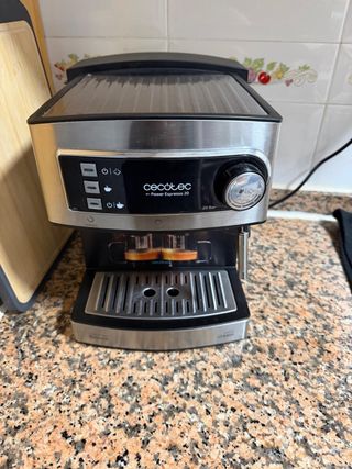 Cafetera de Cecotec, modelo Power Espresso 20. - Diseño moderno en acero inoxidable. - Panel de control intuitivo. - Incluye portafiltros y bandeja de goteo.