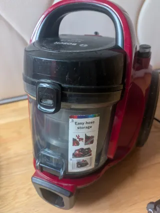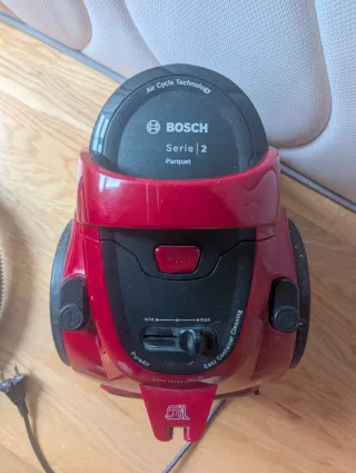 Aspiradora Bosch sin bolsa, modelo Serie 2 Parquet, en color rojo. - Tecnología Air Cycle. - Fácil limpieza del depósito. - Almacenamiento de manguera. - incluye cepillos alfombra y boquilla estrecha
