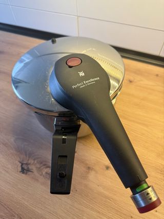 Olla a presión de la marca WMF con capacidad de 4,5 litros. Fabricada en Alemania. - Modelo Perfect Excellence. - Acabado en acero inoxidable pulido. - Asa ergonómica de tacto frío. - Válvula de seguridad y control de cocción.