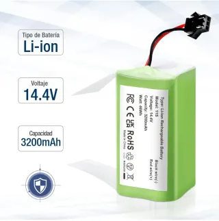 Detalles del producto Lo más destacado Cantidad de pilas1 Litio Ion (Tipo de pila necesaria) MarcaFirstPower Composición de celdas de bateríaLitio Capacidad de la batería2800 Miliamperios hora (mAh) Usos recomendados para el productoAspiradora Número de unidades1.0 Conteo 🏆 【Compatibilidad 】Voltaje: 14.4V, Capacidad: 3200mAh. Si no está seguro de si es compatible con su modelo, consúltenos primero. La batería Compatible con Conga 990 950 1090, DEEBOT N79S N79 DN622, Tesvor X500, Eufy RoboVac 11 11S 11S MAX 12 15T 15C 15C MAX 30 30C 30 MAX 35C, IKOHS NETBOT S14 S15.⭕ NO COMPATIBLE con Conga 1290 1390 1490 1590 Genio Deluxe 370 Gutre