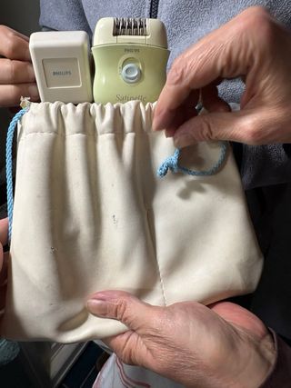 Depiladora Philips Satinelle en color verde claro. Incluye todos los accesorios que se ven en la foto. - Depiladora Philips Satinelle - Cargador - Funda de tela - Cabezal protector - Cepillo de limpieza