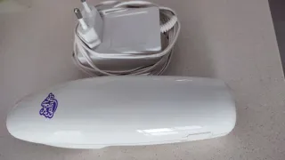 Depiladora eléctrica de la marca Grundig, en color blanco y morado, con un diseño floral. Incluye adaptador de corriente.Viene con un pequeño cepillo de limpieza. Se acompaña de una funda de malla para guardarla.