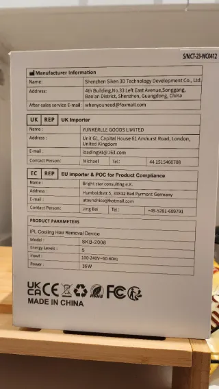 Dispositivo de depilación IPL SKB-2008, totalmente nuevo, sin usar. Funciona con tecnología IPL para la eliminación del vello. - Modelo: SKB-2008 - 5 niveles de energía - Entrada: 100-240V~50-60Hz - Potencia: 36W - Caja abierta, pero sin uso.