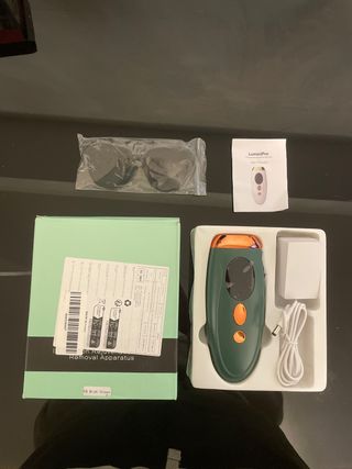 Depiladora Luminipro en color verde oscuro. Incluye gafas protectoras y manual de usuario. - Depiladora de luz pulsada. - Color verde oscuro. - Incluye gafas. - Incluye manual.