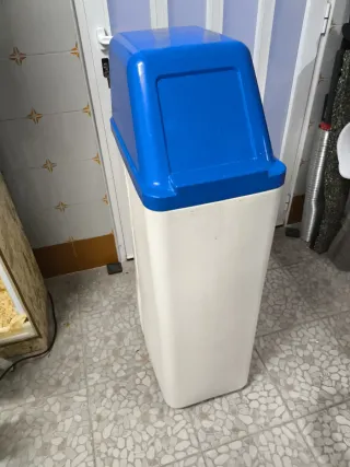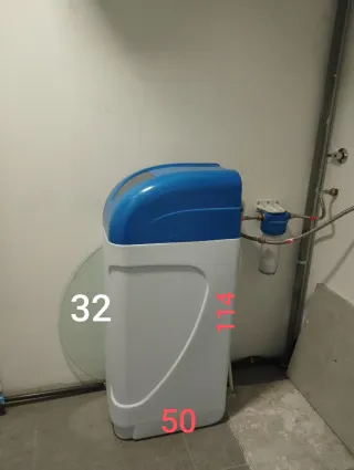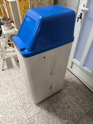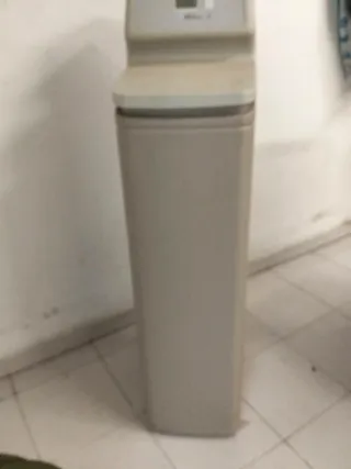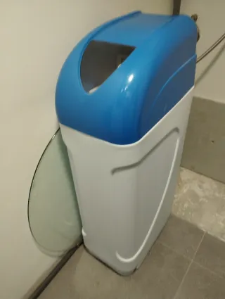 Descalcificador de agua con diseño moderno y funcional. Se ha utilizado solo durante 3 meses y lo queremos cambiar porque vamos a poner otro compacto. Se puede venir a ver sin ningún compromiso. La tapa azul de arriba está suelta, pero se puede ajustar con un tornillo.