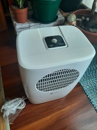 Deshumidificador DeLonghi Ariadry Slim, ligero y de diseño compacto. - Capacidad de 14 litros/24h. - Función light and space-saving. - Panel de control con ajuste de potencia. - Está usado, funciona bien pero para mi gusto hace ruido como para dormir con él encendido, por eso he comprado uno silencioso y vendo este. Tiene un celo colocado que ya no recuerdo por qué se lo había puesto (no sé si estaba floja la carcasa), pero no afecta a su funcionamiento.
