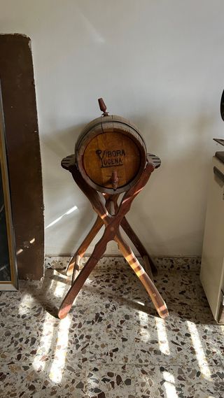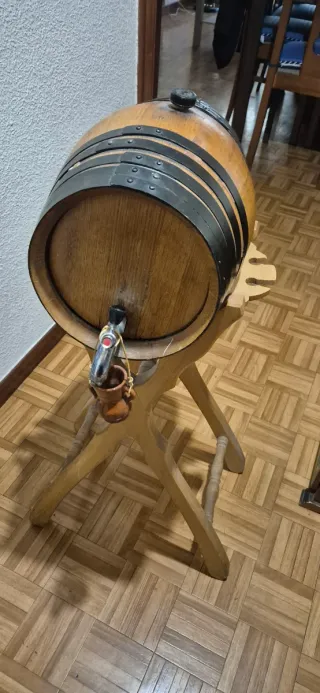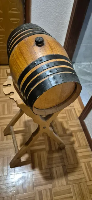 Barril de madera para vino, ideal para bodegas o decoración. Contiene oloroso de bodega. Bien rico. - Soporte de madera incluido. - Diseño rústico y elegante. - Grifo dispensador.