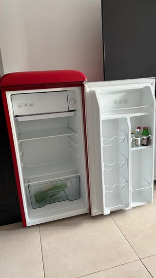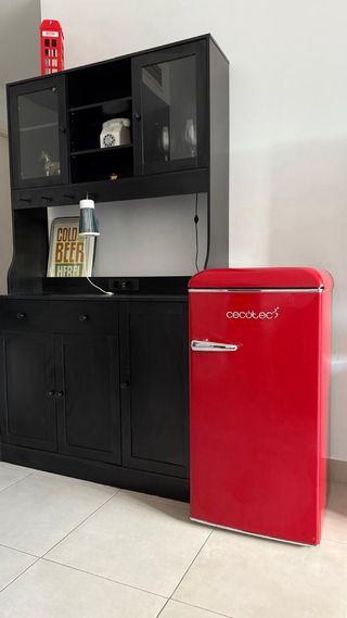 Vendo mini frigorífico retro Cecotec color rojo, de 1 puerta, con icebox/congelador interior. Diseño vintage con tirador cromado, muy práctico para bebidas y alimentos. Interior con estantes y cajón, y puerta con baldas para botellas/latas. Funciona correctamente (enfría y congela). Ideal para salón, oficina, habitación o apartamento. Recogida en mano.