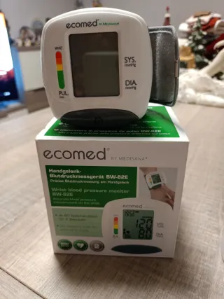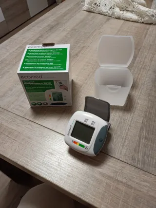 Tensiómetro de muñeca de la marca Ecomed, modelo BW-825. Incluye el dispositivo y su estuche de plástico. - Diseño compacto y portátil. - Pantalla digital clara. - Indicador de pulso.
