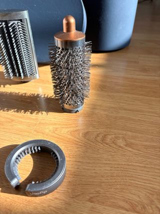 Conjunto de accesorios para el secador Dyson Airwrap. - Cepillo voluminizador. - Barriles para rizar y ondular. - Cepillo desenredante. - Accesorio de secado. No tengo la caja