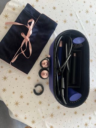 Set completo de moldeador Dyson Airwrap en color morado y detalles dorados. Incluye el secador y varios accesorios para diferentes estilos de peinado. - Secador de pelo Dyson. - Accesorios para rizar, alisar y dar volumen. - Caja de almacenamiento original. Tambien incluye estuche de tela. - Incluye varios accesorios para diferentes estilos de peinado.