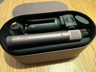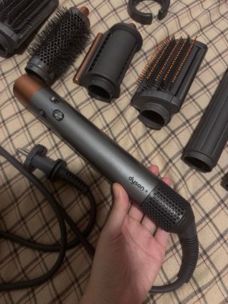Conjunto de accesorios para el Dyson Airwrap. - Incluye varios barriles y cepillos. - Diseñados para diferentes estilos de peinado. - Color gris con detalles en magenta. El funcionamiento del Dyson Airwrap es perfecto. Sin embargo, cuando se calienta demasiado tras aproximadamente 15 minutos, el dispositivo me alerta de que es necesario limpiar el filtro.