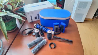 Set de accesorios para rizador Dyson Airwrap. - Incluye el rizador principal en color azul. - Varios cabezales y cepillos para diferentes estilos. - Estuche de almacenamiento azul.