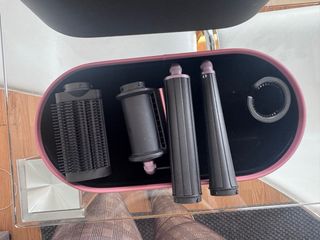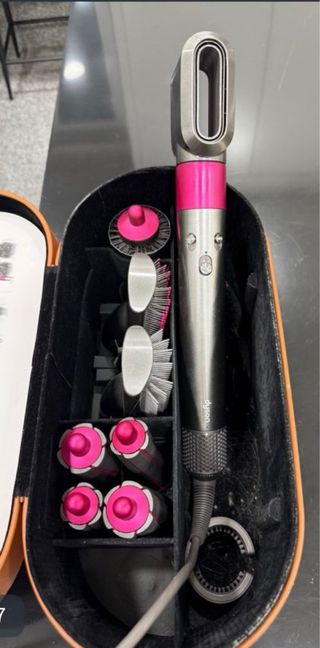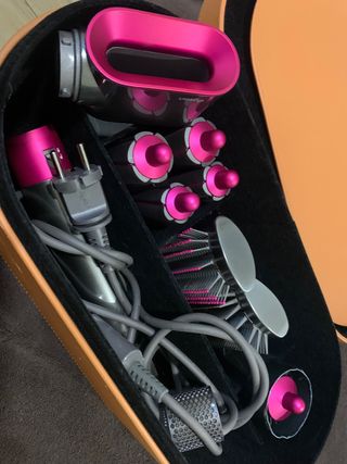 Set de peinado Dyson Airwrap en tonos rosa y plateado. Incluye varios accesorios para diferentes estilos. Lo tenia en segunda residencia. - Secador de pelo. - Cepillos redondos. - Barriles para rizar. - Cepillo desenredante. - Estuche de almacenamiento.