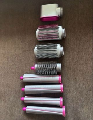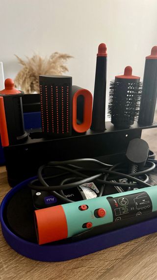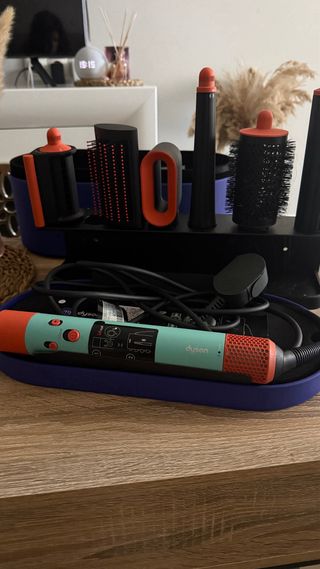 Moldeador de cabello Dyson Airwrap con accesorios. - Incluye varios cabezales para diferentes estilos. - Diseño ergonómico y moderno. - Base organizadora para guardar los accesorios.