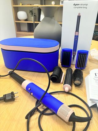 El Dyson Airwrap en un elegante color azul con detalles dorados. Incluye varios accesorios para diferentes estilos de peinado. - Incluye estuche de almacenamiento. - Accesorios para rizar, alisar y dar volumen.