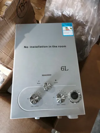 Calentador de agua a gas de 6 litros, ideal para autocaravanas y caravanas. Diseñado para una instalación segura fuera de la habitación. - Capacidad de 6L. - Ducha y manguera. - Control de gas y agua. - Indicador digital de temperatura. - Indicaciones para uso en invierno y verano. - Medidas 44×30×13 cm