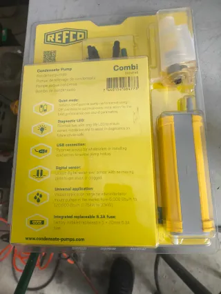 Bomba de condensado REFCO modelo Combi. - Modo silencioso configurable. - LED de diagnóstico de dos colores. - Conexión USB para historial. - Sensor digital de nivel de agua. - Aplicación universal. - Fusible reemplazable de 6.3A.