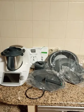 Robot de cocina Thermomix en color blanco. Un ayudante versátil para tu cocina. - Diseño moderno y elegante. - Pantalla táctil a color. - Incluye accesorios.