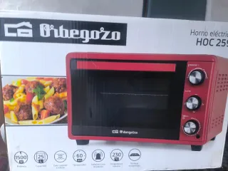 Horno eléctrico Orbegozo de color rojo. - Potencia: 1500 W - Capacidad: 25 L - Calor superior e inferior - Temporizador hasta 60 min - Señal acústica de parada - Temperatura máxima: 230 °C - Bandeja recogemigas