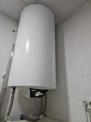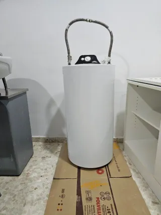 Termo eléctrico de 100 litros de capacidad. Ideal para calentar agua en el hogar. - Color blanco. - Conexiones flexibles superiores.