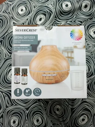 Difusor de aromas SilverCrest con diseño de madera. - Nuevo,sin sacar de su caja. - Crea una fina niebla fría mediante ultrasonidos. - Se puede usar como ambientador añadiendo aceites esenciales. - Capacidad de 300 ml. - Incluye 2 aceites esenciales.