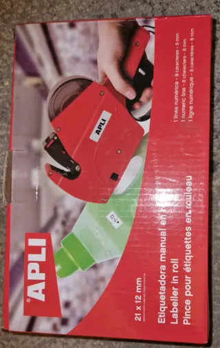 Máquina etiquetadora manual de la marca APLI. - Modelo: Etiquetadora manual en roll. - Medida de etiqueta: 21 x 12 mm. - Capacidad: 1 línea numérica de 8 caracteres.