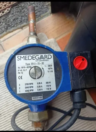 Bomba de agua SMEDEGARD modelo EV 2-72-2C. Funciona bien. - Voltaje: 1-230 V - Frecuencia: 50 Hz - Protección: IP 42, CL.F - Presión nominal: PN 10 - Número de serie: 0810-06769 - Temperatura máxima: TF 110 - Velocidades y consumos: - 2700 RPM | 0,95 A | 200 W - 2640 RPM | 0,85 A | 170 W - 2340 RPM | 0,60 A | 115 W