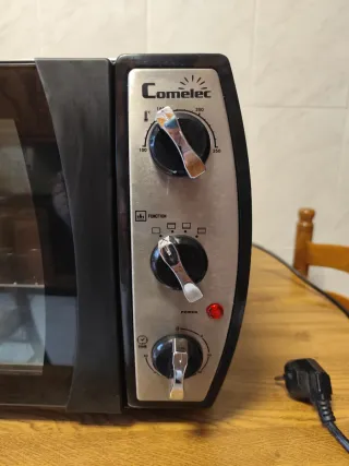 Mini horno eléctrico Comeltec con acabado plateado y negro. - Puerta de cristal. - Mandos giratorios para control de temperatura y función. - Indicador luminoso de encendido.