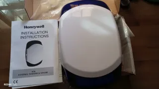 Sirena exterior de seguridad marca Honeywell, modelo AG8. - Diseño blanco y azul. - Incluye manual de instalación.