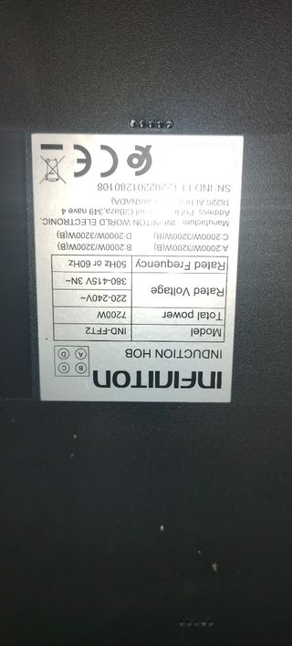 Vitrocerámica de inducción INFINITON modelo IND-FFT2. - Potencia total de 7200W. - Voltaje: 220-240V~ / 380-415V 3N~. - Frecuencia: 50Hz o 60Hz. - Fabricante: INFINITON WORLD ELECTRONIC. - Serie: INDIT12202201280108. Es un modelo de alta gama TV