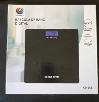 Báscula de baño digital, marca Euro Life, modelo CD-28B. Cuenta con una pantalla LCD con luz para una fácil lectura. -Capacidad máxima de 180 kg. -Indicador de batería baja. -Auto ON/OFF. -Funciona con 2 pilas AAA incluidas. -Tamaño báscula: 28 cm x 28 cm. Nueva, a estrenar.