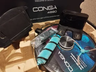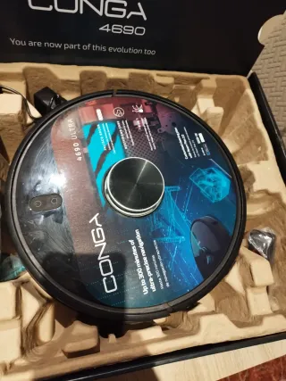 Robot aspirador Conga 4690 Ultra en perfecto estado. Diseñado para una limpieza eficiente y autónoma. - Incluye cepillo Jalisco. - Tecnología Bestfriend Care. - Plan de limpieza personalizado con Room Plan 2.0. - Navegación ultraprecisa. -Mando a distancia y pilas sin estrenar. -Mopa de fregado. -Doble depósito uno de sólido y otro mixto -Base de carga. -Manual de instrucciones. -Cepillo lateral. Solo le falta el filtro pero se encuentran fácilmente.