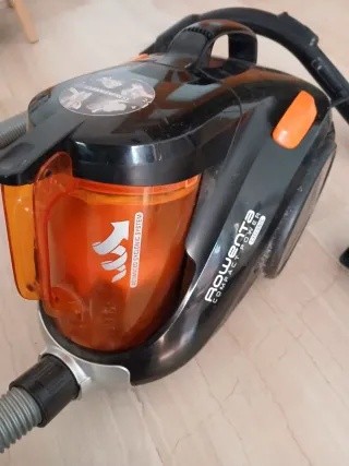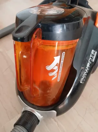 Aspiradora Rowenta Compact Power en color negro y naranja. Cuenta con un sistema ciclónico avanzado. - Diseño compacto. - Depósito extraíble. - Asa de transporte integrada.