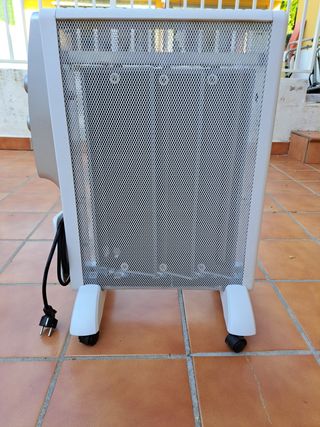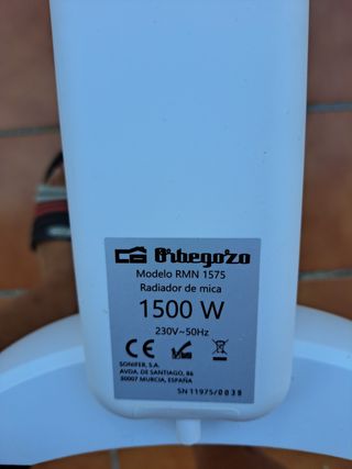Radiador de Mica Orbegozo RMN 1575 con dos niveles de calor. Potencia 1500 W. Termostato regulable temperatura. Rápida convección y difusión del calor. Emisor termico sin aceite. Incluye recogecables. Comprado nuevo hace 2 años y con muy poco uso. Tiene una mancha en un frontal. Sin garantía.
