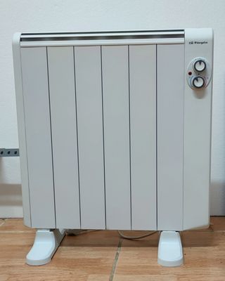 Calentador eléctrico de la marca Orbegozo. Emisor térmico bajo consumo, 1000 W, 6 elementos, aluminio, mando a distancia, funcionamiento programable, botón de desconexión total, pared o pie. - Diseño moderno con acabado en blanco. - Panel de control digital. - Patas de apoyo incluidas. - Mando incluido. - Programable.