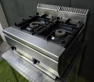 Cocina Industrial a gas de FAGOR 2 fuegos de sobremesa Quemadores: 3 KW * 2 / Potencia total: 6 KW. Dimensiones: 400x650x290 Fuegos abiertos con válvula de seguridad y termopares. Piezoeléctrico para el encendido de los quemadores. Parrillas dobles y quemadores esmaltados. Dimensiones de la parrilla doble: 286x534 mm.- Encimera única recoge grasas de acero inoxidable. De unico uso domestico. Comprada nueva. Disponible a finales de noviembre. Disponible a finales de noviembre.Ideal para restauración .