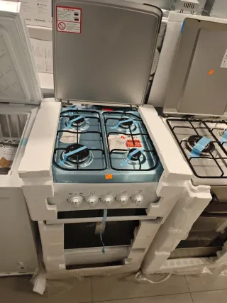 Cocina de gas con cuatro quemadores y horno. - Encimera de acero inoxidable. - Tapa de aluminio - Mandos frontalesñ 3 años de garantía