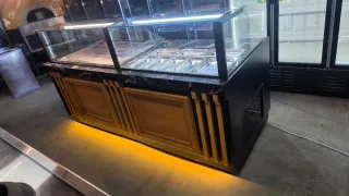 Vitrina expositora refrigerada con diseño moderno y elegante. - Encimera de mármol negro veteado. - Frontal con paneles de madera y detalles dorados. - Iluminación LED inferior cálida. - Bandejas de acero inoxidable en el interior.