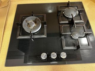 Encimera de gas natural Siemens con tres quemadores. Ideal para tu cocina. - Superficie de cristal negro. - Mandos frontales. - Parrillas de hierro fundido. Para mdulo de 60
