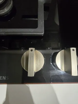 Vitrocerámica de gas de la marca Siemens. Diseño moderno y elegante. - Encimera de cristal. - Mandos giratorios de acero inoxidable.
