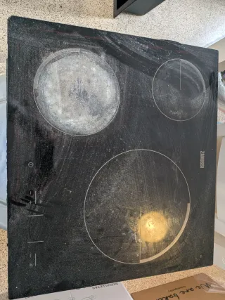 Vitrocerámica de la marca Zanussi. Dimensiones: 59cm x 52cm x 4cm - Encimera de cristal negro. - 3 zonas de cocción. - Controles táctiles. Esta sucia y con cal por la reforma. Funciona perfectamente todo. El único desperfecto que tiene es una de las esquinas (ver la foto). Pero esta limado y no supone ningún problema. Solo estético. SOLO RECOGIDA, NO LA ENVIO