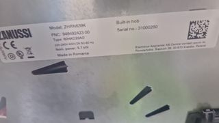 Vitrocerámica Zanussi modelo ZHRN639K. - Tipo: 60HAD20A0 - Potencia nominal: 5.7 kW - Voltaje: 220-240V/400V2N 50-60 Hz - Fabricada en Rumanía - Tipo de encastre: Encimera - Número de serie: 31000260