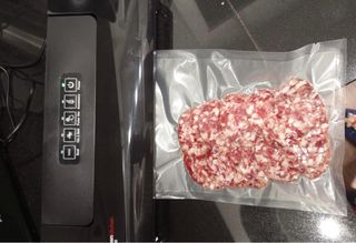 Máquina envasadora al vacío CASO VC10, ideal para conservar alimentos. - Diseño moderno en color plateado. - Panel de control táctil. - Incluye bolsa de vacío con carne.