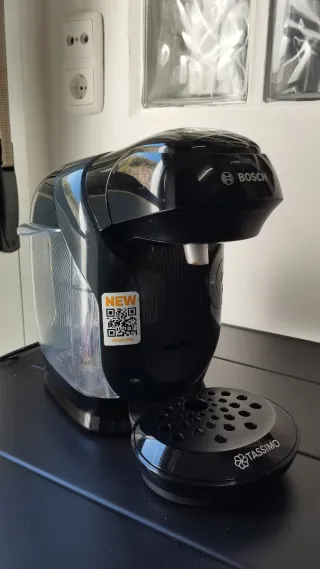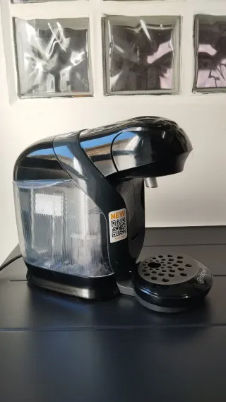 Cafetera de cápsulas Bosch Tassimo en color negro. Diseño moderno y compacto. - Depósito de agua extraíble. - Bandeja de goteo ajustable. - Incluye etiqueta NEW con código QR.